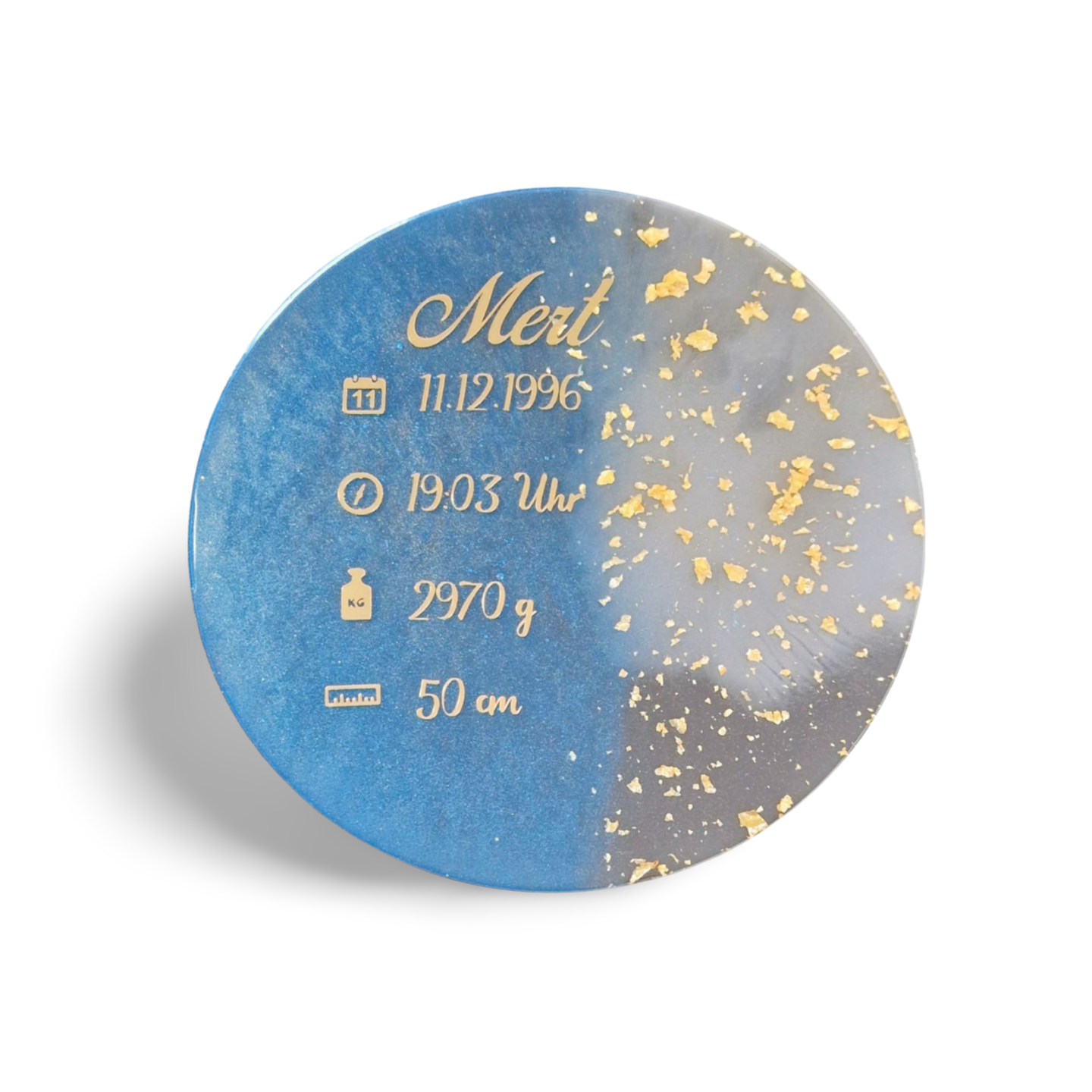 Unser handgefertigtes EpoxyTablet in runder Form ist mehr als nur ein dekoratives Element. Es ist ein Statement von Eleganz und Einzigartigkeit, das Ihre besonderen Lebensmomente in den Vordergrund rückt.